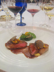 雉の中に鴨の詰め物をしたフォアグラに葡萄果汁を煮詰めたソースには、ブルゴーニュの赤ワイン メオカミュゼのヴォーヌ・ロマネ2000。 ほわっとやわらかく、リンゴアメみたい。