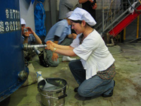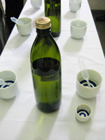 私はというと、朝の3時頃、眠い目をこすりながらムックリ起きて蔵へ出陣。日の出とともに、できあがったお酒が瓶詰めされ、ラベル貼りの鬼と化します(...自称、おた福♪)。1枚1枚手作業で貼っていくんですが、これがけっこう難しい。ちょっとゆがむと、親分の厳しい突っ込みが入ってやり直し。