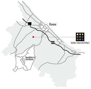 州都ボローニャから南東へ100kmほどのところにあるシーサイドリゾートの町リミニと、そこから10kmほど内陸にある小さな独立国家サン・マリノ共和国の間に位置するコヴィニャーノの丘に、サン・ヴァレンティーノのワイナリーがあります。