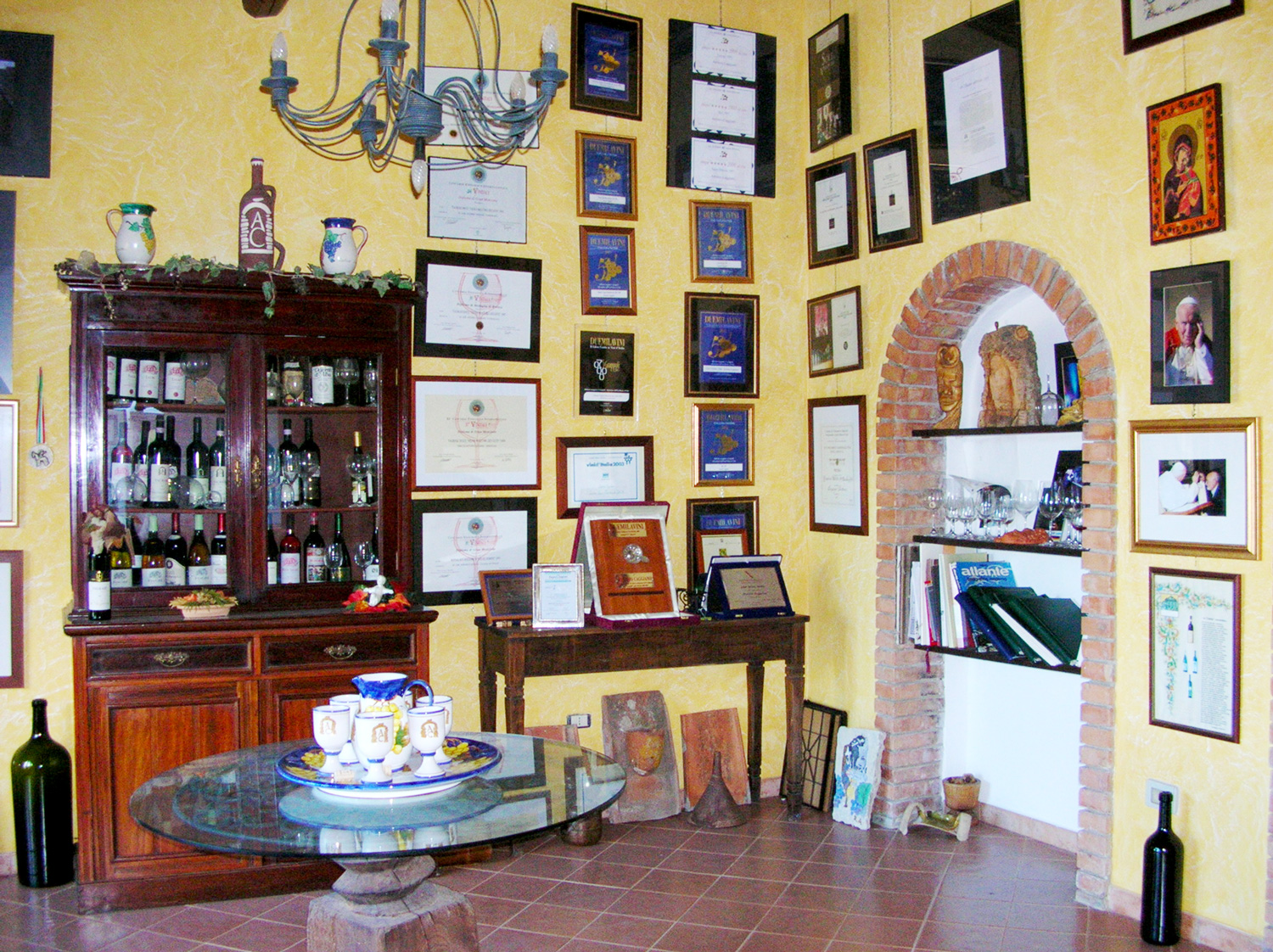 中へ入ってまず目に飛び込むのが、まるで写真ギャラリー展に来たのではないか、と思わせるパネルコーナー。アントニオさんは、旅をするのも写真を撮るのも好きなのだそうです。そしてその奥には、壁いっぱいに飾られた写真と、ワインコンテストで受賞した賞状の数々。