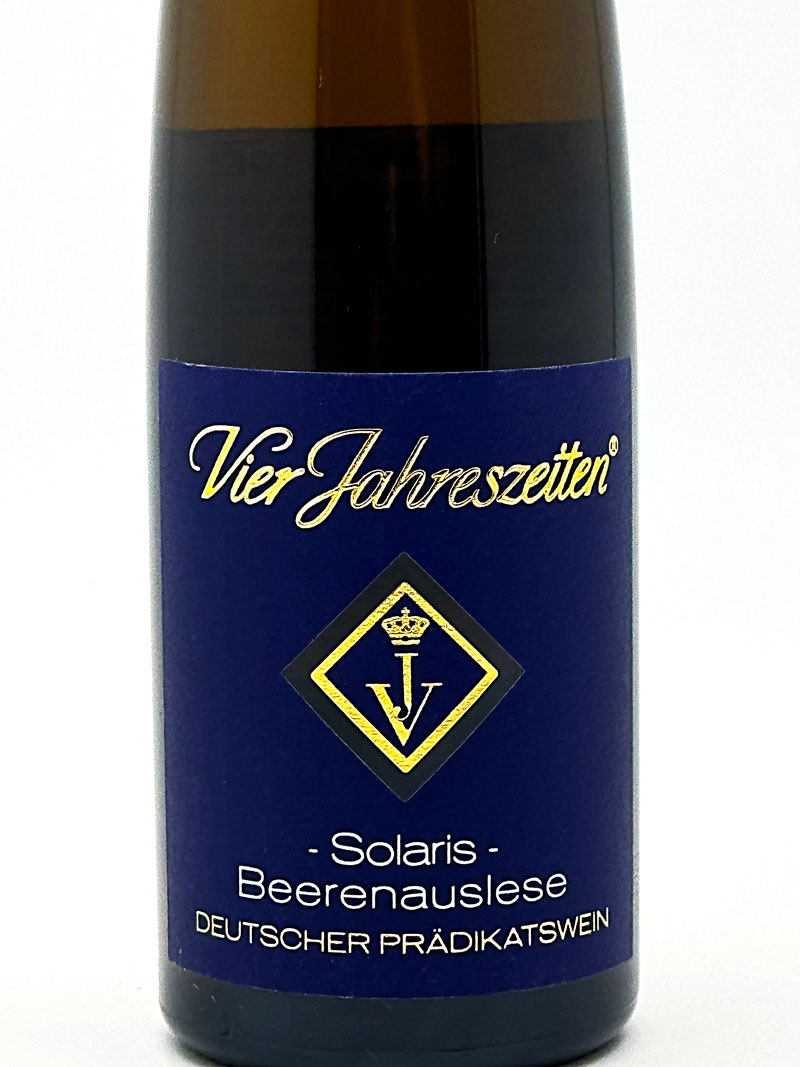 メルツリングとGm6493の交配によって生まれたソラリスは、早熟で糖度の高い葡萄が得られるため、「太陽」に因んで名付けられ、ドイツ全体でも50haほどしか栽培されていない希少な品種。コケモモのような香りの柔らかい甘味があり、旨味ののった貴腐ワイン。