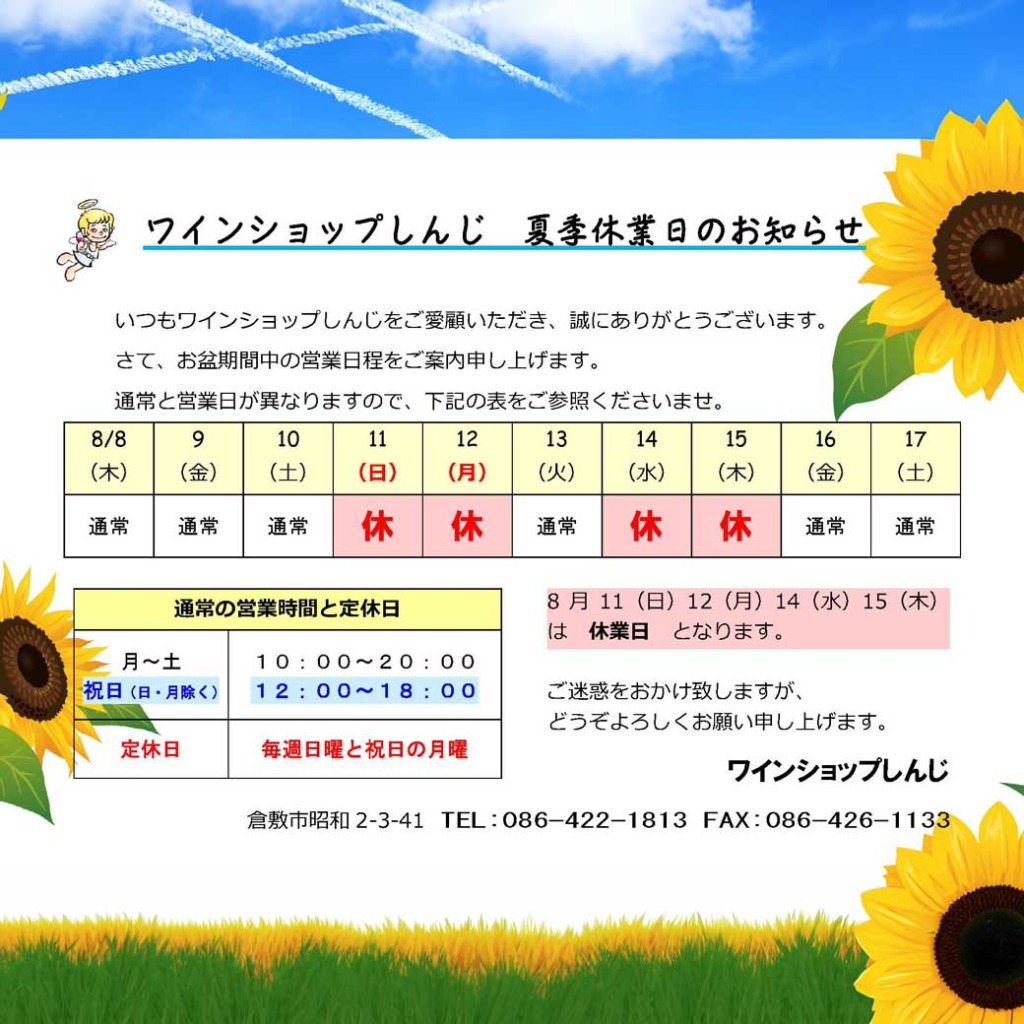2024 夏期休業日のご案内 2024.08.11 LINE note <お盆休みのご案内> 8/14(水)15(木)お休みします。8/13(火)は、開いてます♪ お店のワインセラーは涼しか~ワインを選びながらヒンヤリ 涼んでくださいね。 Post Share Hatena LINE RSS feedly Pin it note 8/31(土)ワインフェスティバル 2024 3/20(木祝)夜 Chプピーユ 来日メーカーズディナー開催のご案内 最新のお知らせお知らせ一覧 2025.08.17 8/30(土)グランヴィア ワインフェスティバル 2025.08.08 【2025年 夏期休業日のお知らせ】 2025.07.02 7/12(土)大人の夜市に今年も登場! in アリオ倉敷 2025.02.21 3/20(木祝)昼 Chプピーユ 来日セミナー 2025.02.21 3/20(木祝)夜 Chプピーユ 来日メーカーズディナー開催のご案内