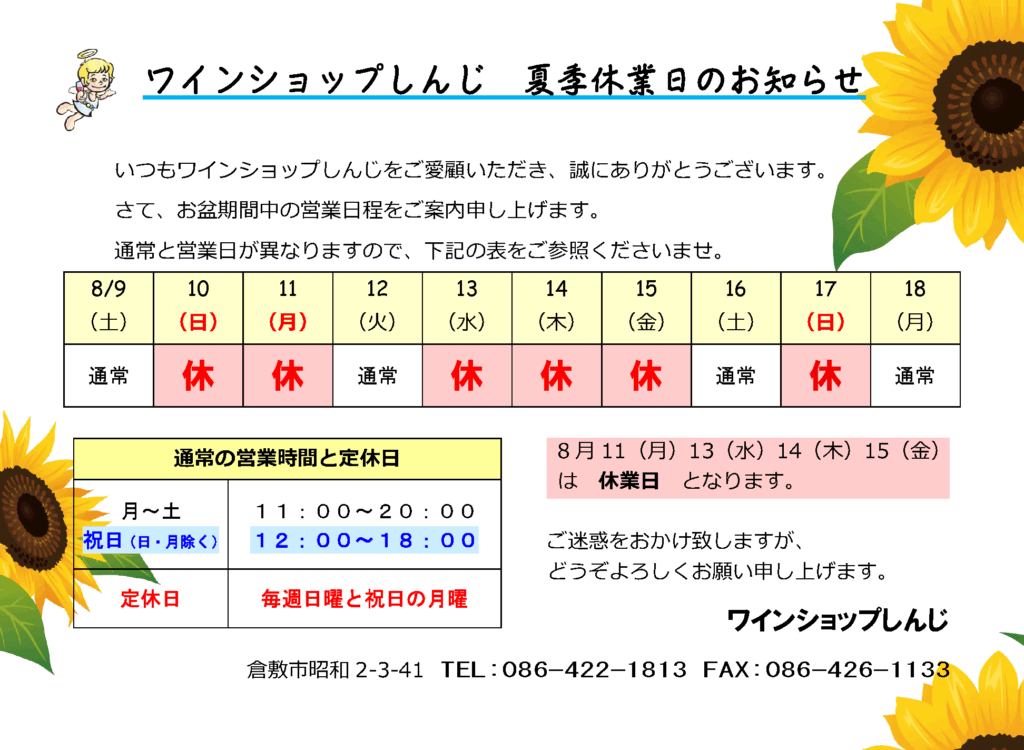休業日:8月11日(月)・13日(水)・14日(木)・15日(金)・17日(日)