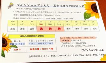 今年の夏は、8/11(日)、8/12(月)、8/13(火)と3日間休業します。8/14(水)からは、通常どおり営業します。お盆明けてもまだまだ外壁修復中ですが、どうぞよろしくお願いいたします。#ワインショップしんじ…