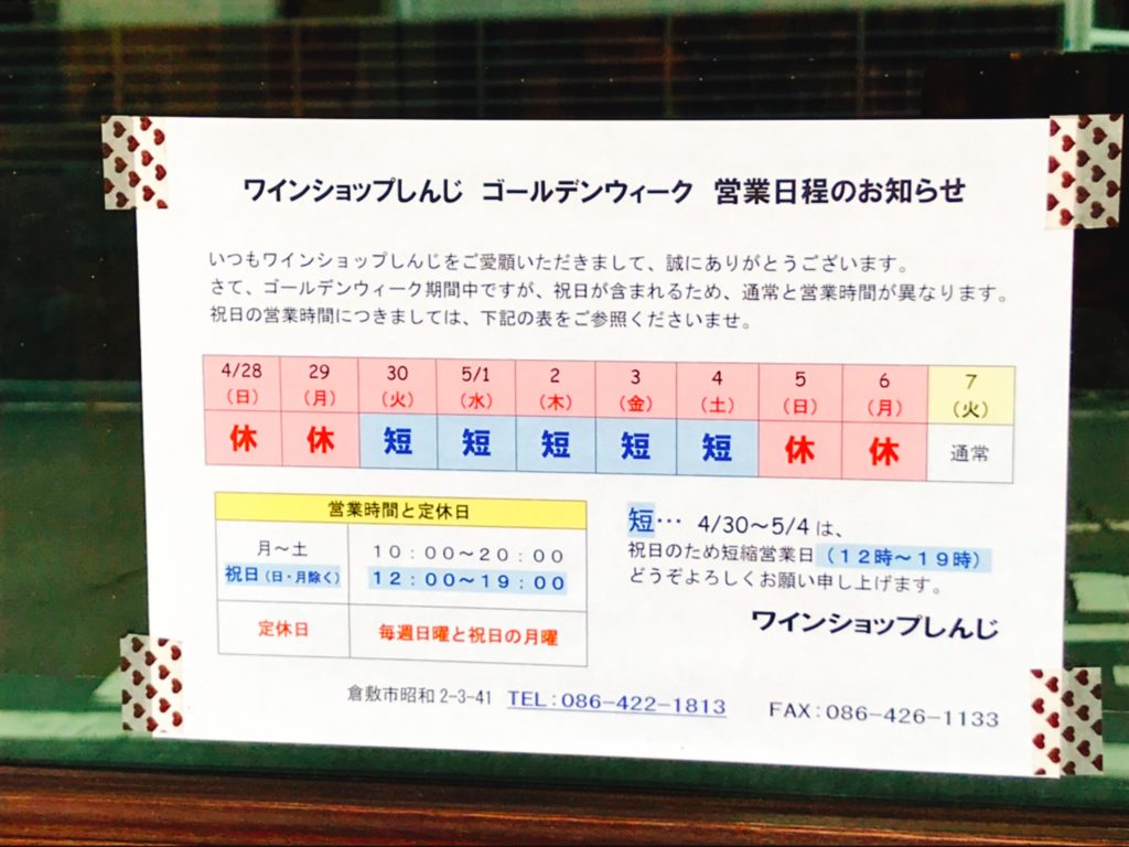 ゴールデンウィーク中は、4/27(土)は通常営業。日曜と祝日の月曜の定休日以外は、12:00~19:00の短縮時間で営業しています。